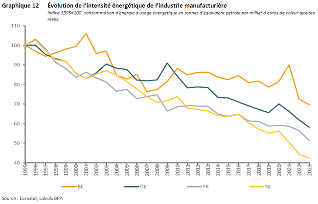 Enfin, l’étude souligne que la compétitivité des entreprises industrielles est fragilisée par la hausse des coûts salariaux et surtout par la forte intensité énergétique de l’industrie, plus marquée en Belgique que chez ses voisins (voir graphiques). Ces deux contraintes pèsent sur la capacité des entreprises à rester performantes à l’international.